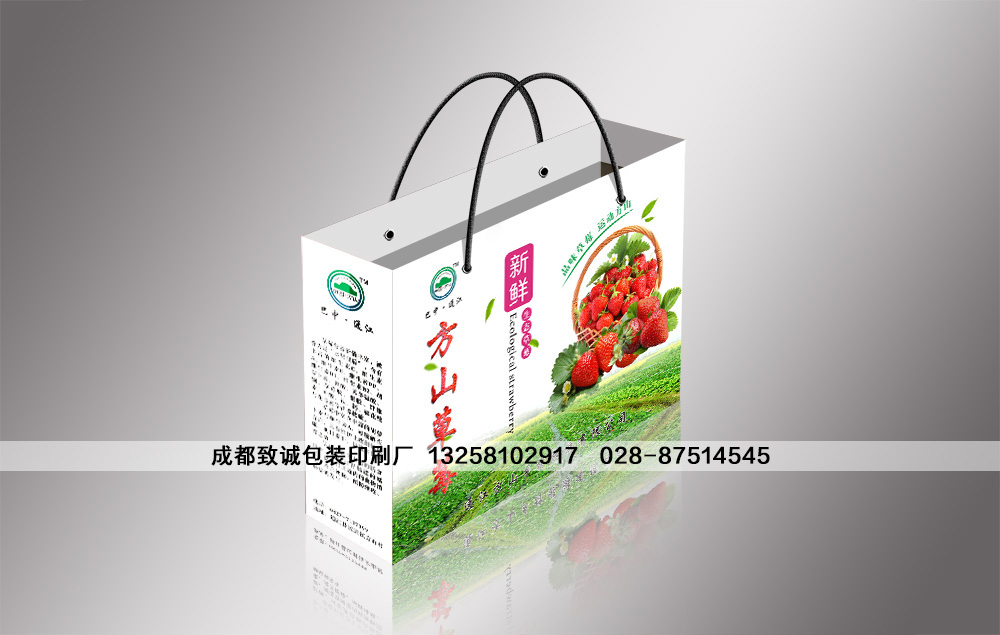 產品尺寸:手提袋290mm(長)*240mm(高)*70mm(寬);大標簽直徑90mm;小標簽直徑25mm;(其他尺寸可根據所裝草莓的重量、盒數進行定制)